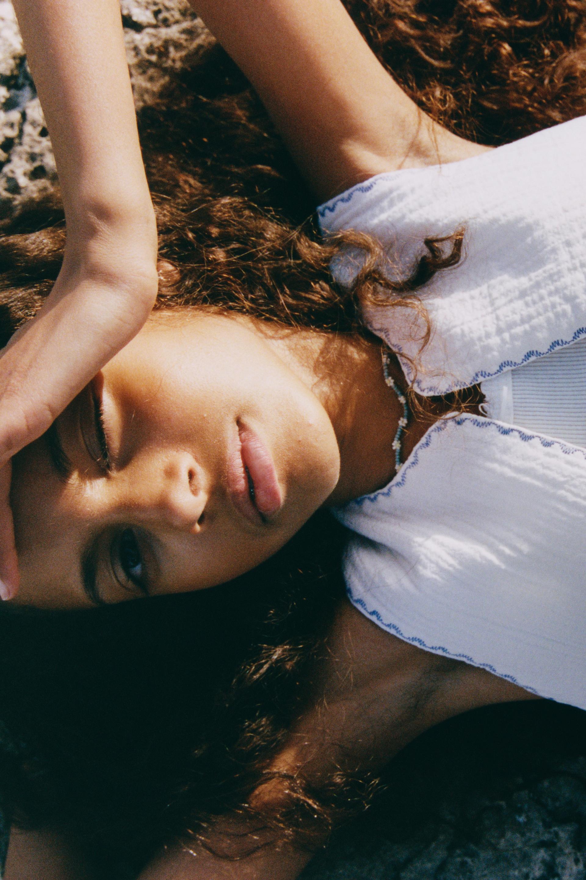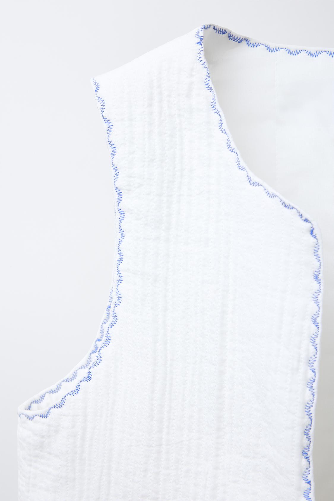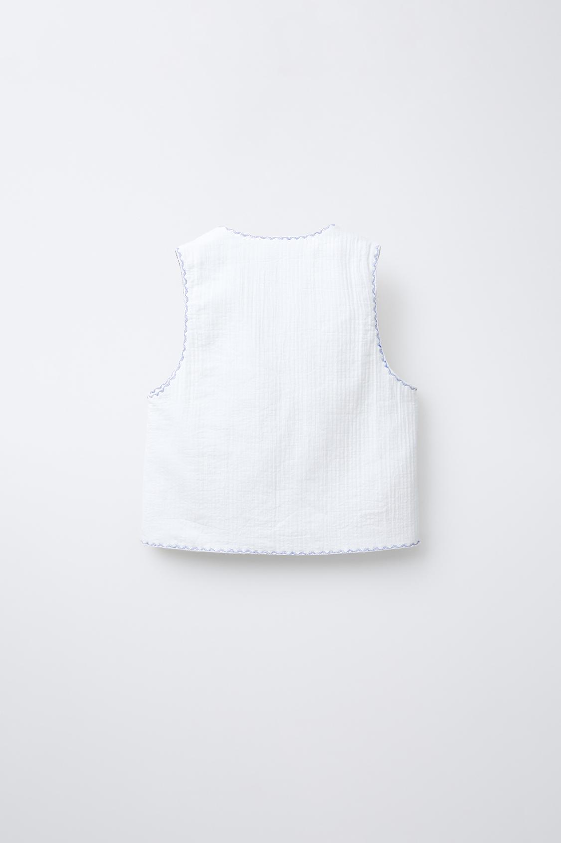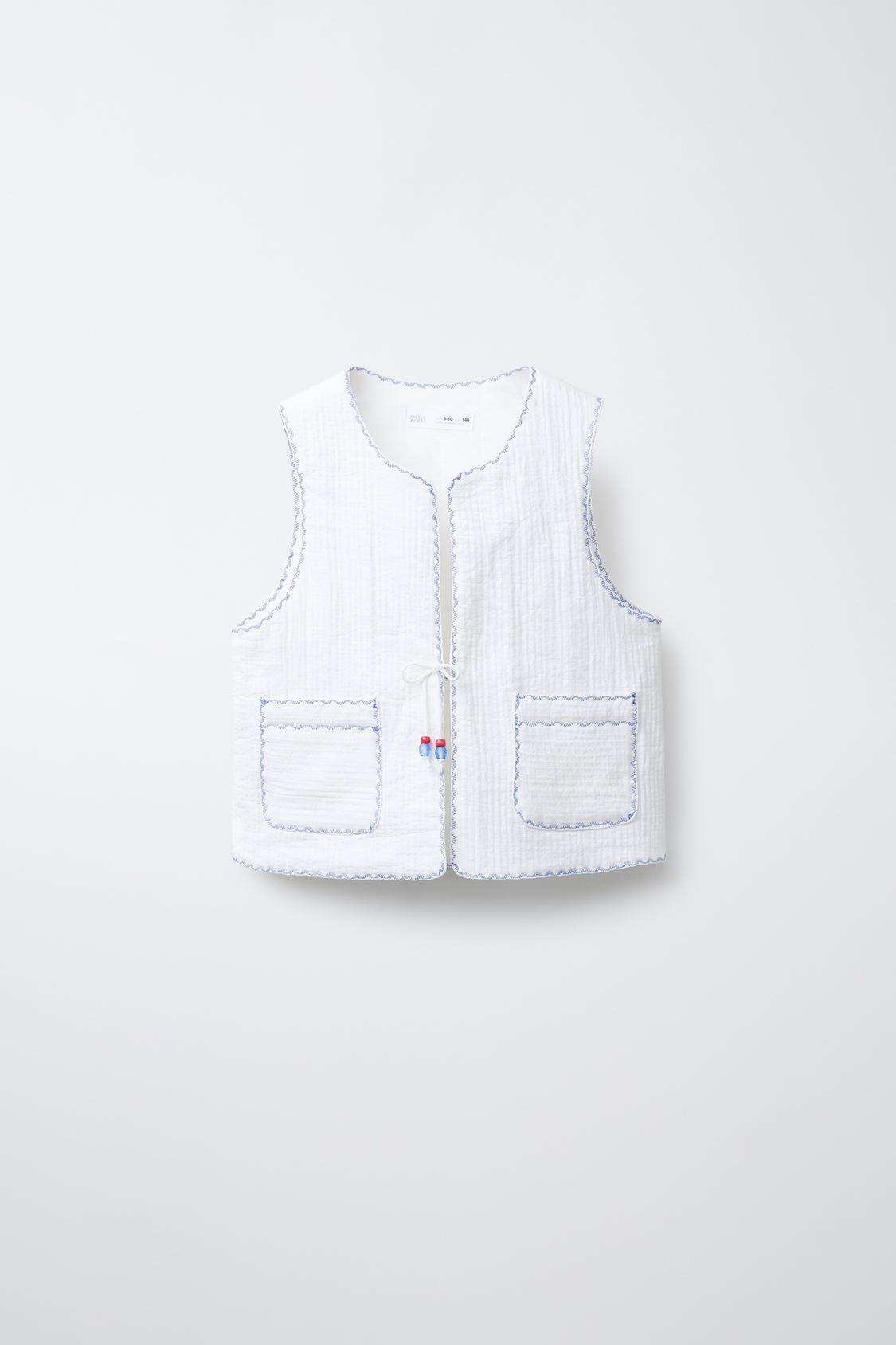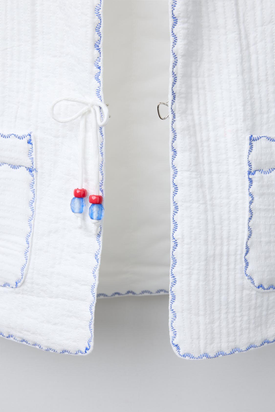 Chaleco con escote redondo y manga sisa. Cierre tipo enganche oculto en delantero. Aplique lazo frontal con abalorios. Bolsillos de tipo plastrón en delantero. Detalle bordados con color a contraste en acabados.