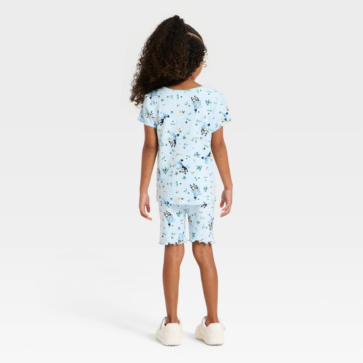 Conjunto de 2 piezas con diseño Bluey para niñas pequeñas. Incluye camiseta y shorts confeccionados en tela pointelle acanalada, suave y transpirable. Mezcla de algodón y poliéster con elastano para mayor comodidad y flexibilidad. Presenta adorables estampados de Bluey y flores primaverales sobre fondo azul claro. Los shorts cuentan con cintura elástica completa para un ajuste seguro y cómodo durante el juego y las actividades diarias. Perfecto para el clima cálido y la comodidad de tu pequeña.