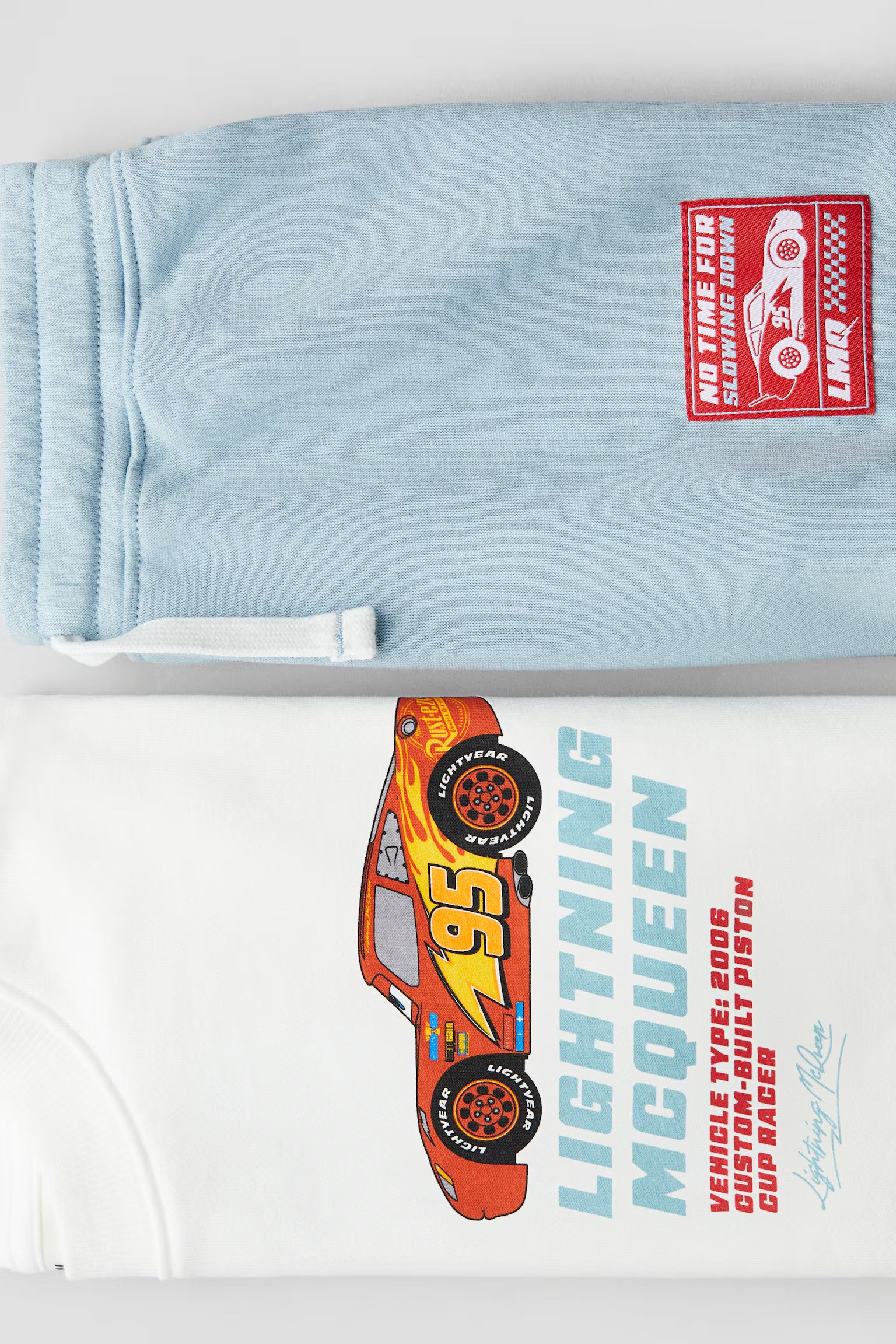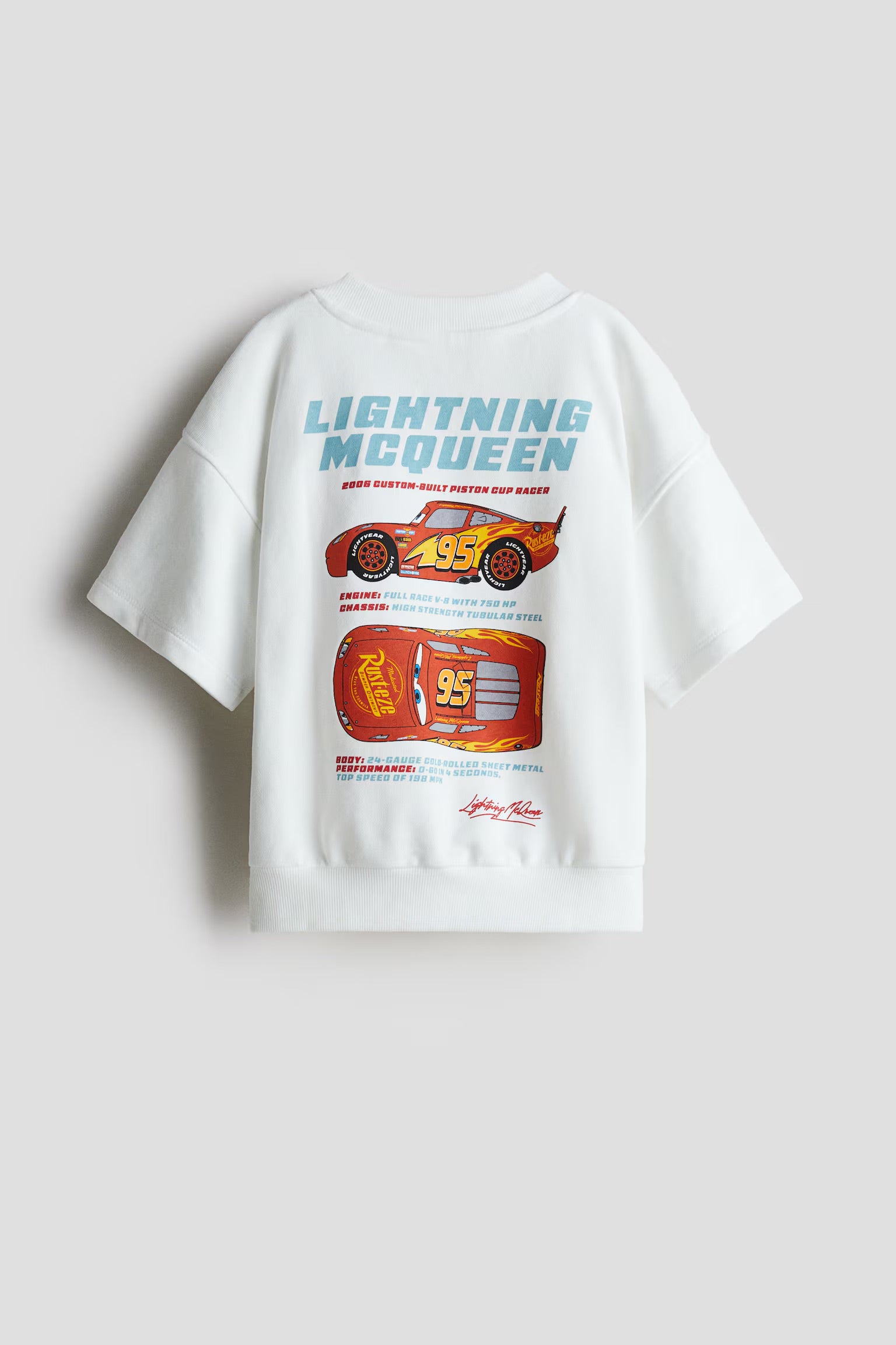 Conjunto de dos piezas en tejido sudadera ligero con estampado. Camiseta de corte relajado con hombros marcadamente caídos, mangas cortas y remate de canalé en cuello y bajo. Pantalón corto con cintura elástica, cordón de ajuste y bolsillos laterales discretos.