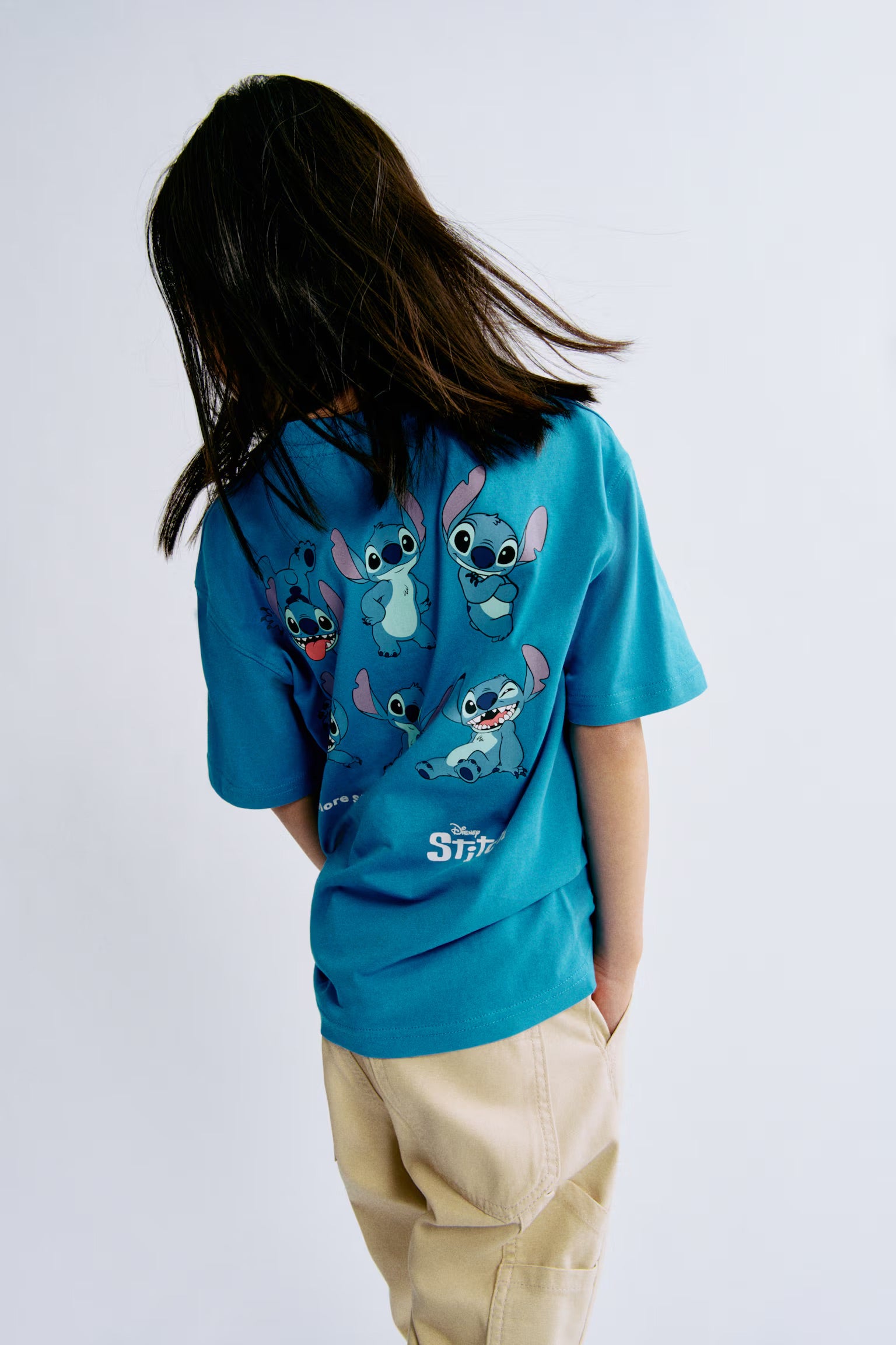 Esta polera oversized de algodón jersey suave ofrece comodidad y estilo con un diseño estampado inspirado en Lilo & Stitch. Cuenta con un escote acanalado y hombros caídos que aportan un ajuste relajado y moderno, ideal para un look casual y cómodo durante todo el día.