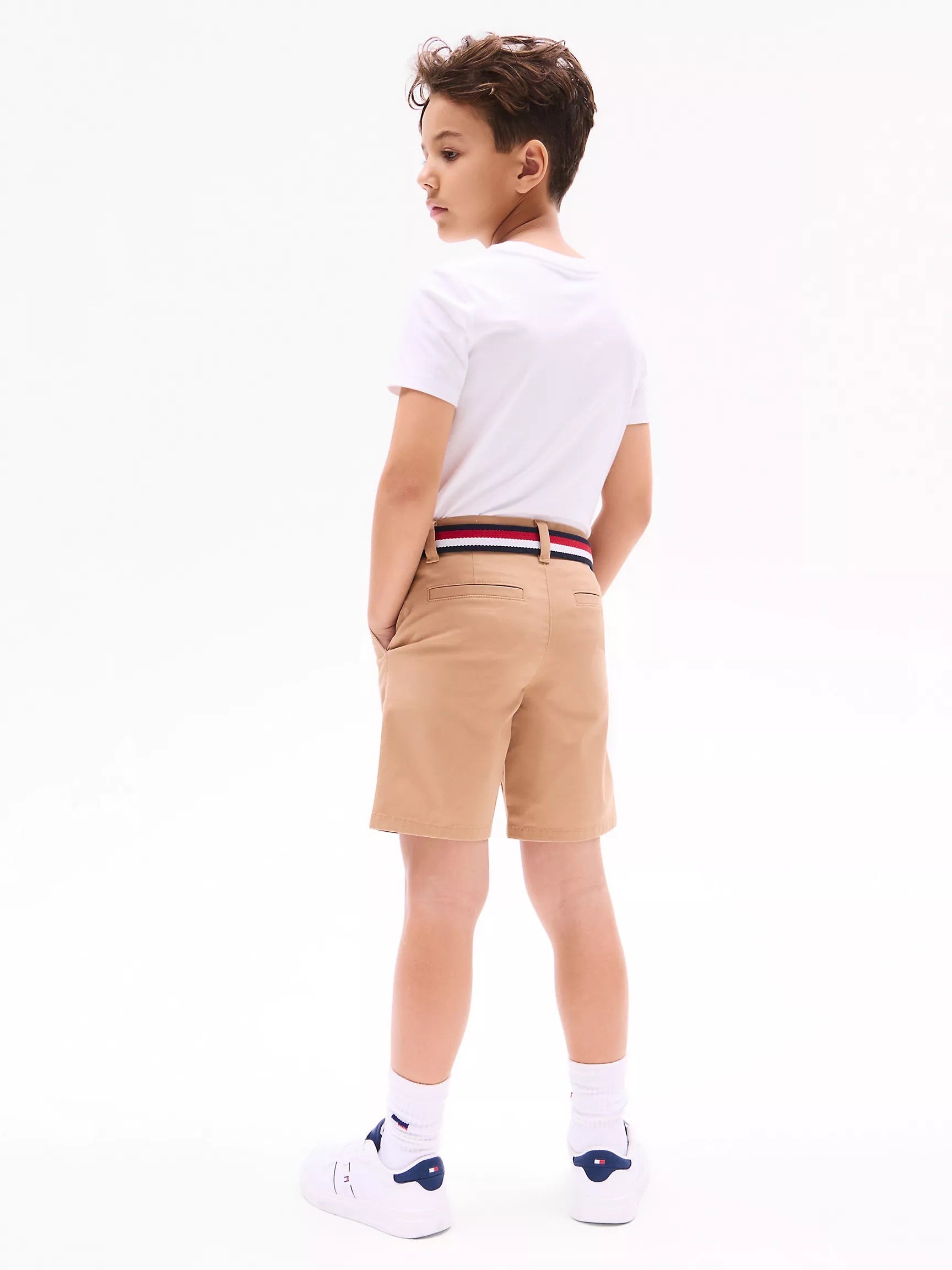 Short con cinturón Tommy que combina estilo clásico y sostenibilidad. Con una silueta tipo chino y cinturón desmontable con franjas distintivas, ofrece un ajuste cómodo y moderno. Fabricado con algodón reciclado certificado proveniente de textiles usados y desechos de manufactura, contribuye a reducir el desperdicio y promueve el cuidado del medio ambiente sin sacrificar calidad ni diseño. Ideal para que los niños luzcan bien y responsables con el planeta.